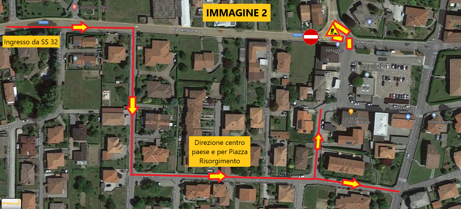 La ditta incaricata dei lavori segnalerà le necessarie deviazioni già sulla rotonda sulla SS 32 Ticinese ma anche più avanti, indicando che per entrare in Varallo Pombia bisognerà necessariamente passare o per Pombia o per Via Vittorio Veneto/Via Monte Grappa e poi dirigersi su Via Don Gnocchi o su Via Isonzo se necessario entrare in Piazza Risorgimento (IMMAGINE 2).