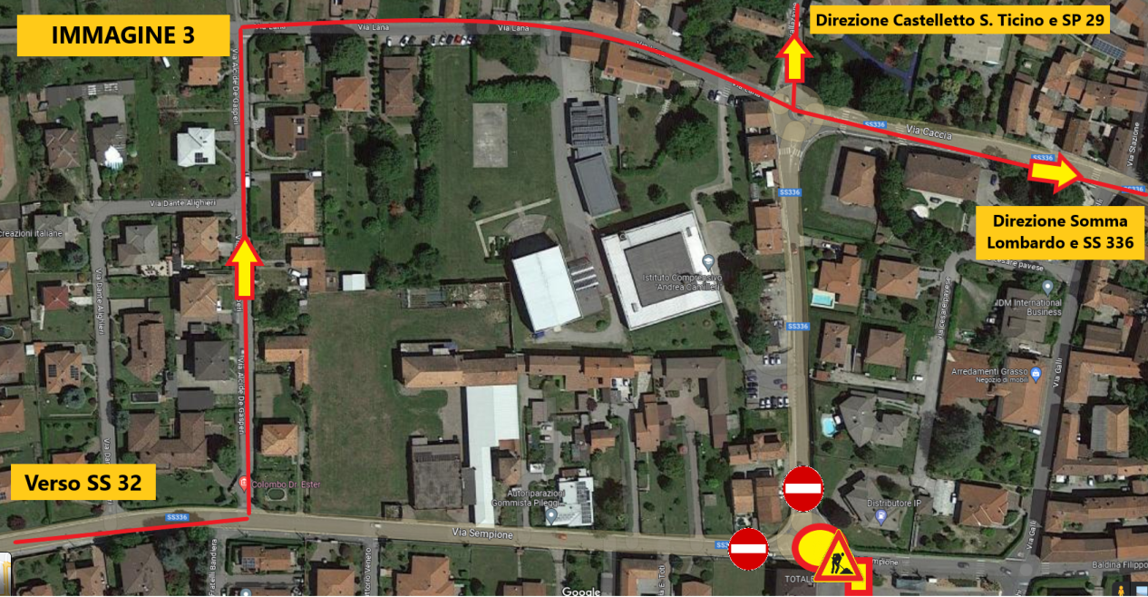 La stessa cartellonistica avviserà anche coloro che, provenienti da Somma Lombardo o Castelletto S. Ticino/Borgo Ticino, transiteranno dalla SS 336 o dalla SP 32. Loro dovranno procedere, per collegarsi alla SS 32 o passando da Pombia, da Via Lana (come raffigurato nell’Immagine 3) o, in caso, anche da Via Stazione.