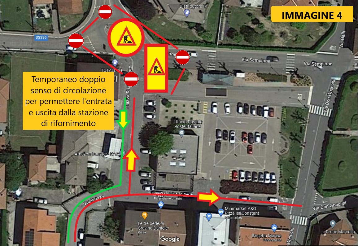 In Piazza Risorgimento la viabilità rimarrà invariata salvo per il tratto davanti alla stazione di benzina che diventerà a “doppio senso” temporaneamente per permettere un minimo di manovra per chi entra ed esce a rifornirsi di carburante (IMMAGINE 4).