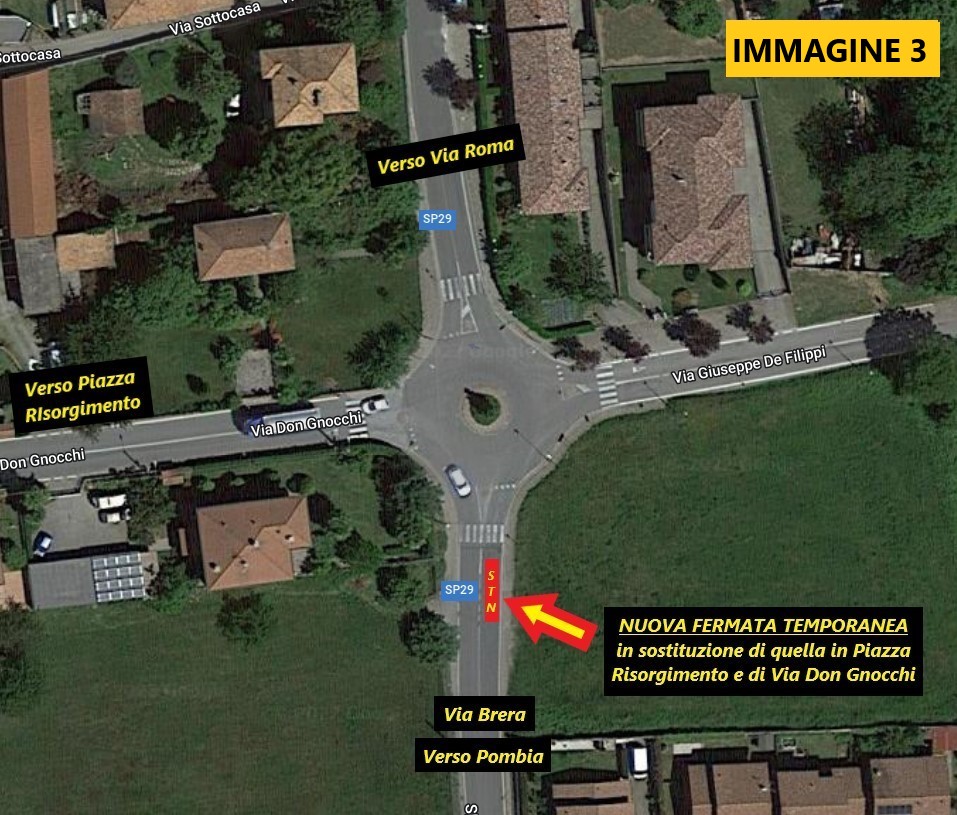 Ci sarà una fermata sola in paese sempre sulla rotonda di Via Don Gnocchi/Via De Filippi e rimarrà la fermata all'altezza di Via Guttuso sulla SP29 (verso Cascinetta).
