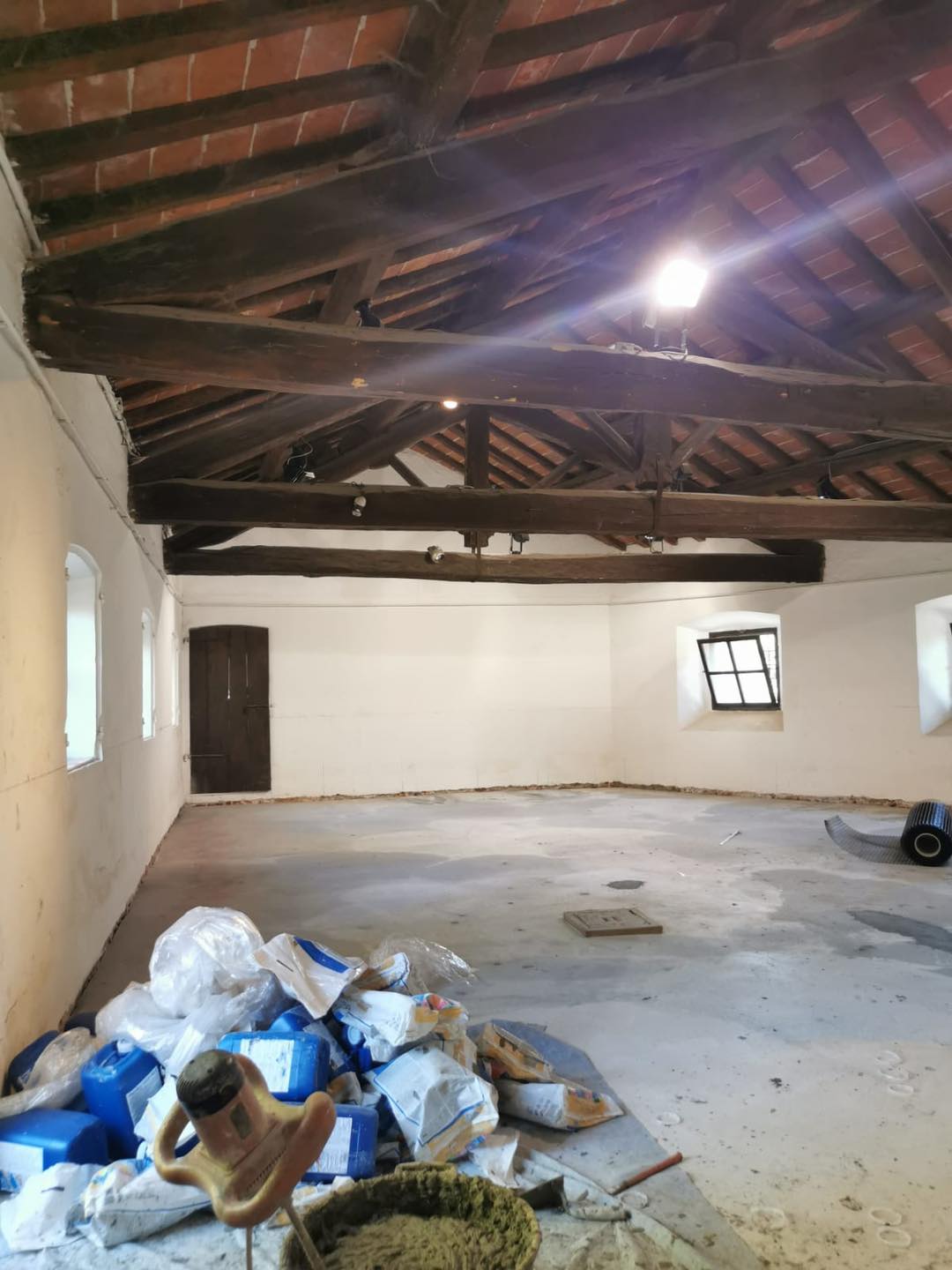 In parallelo, procedono in Pinacoteca i lavori di consolidamento del massetto. Successivamente si passerà alla posa del "cocciopesto" e alla realizzazione dei nuovi servizi igienici. Si sta anche recuperando la "cappelletta" di cui si noterà nelle foto il dettaglio del soffitto a cassettoni, prima nascosto da un controsoffitto.