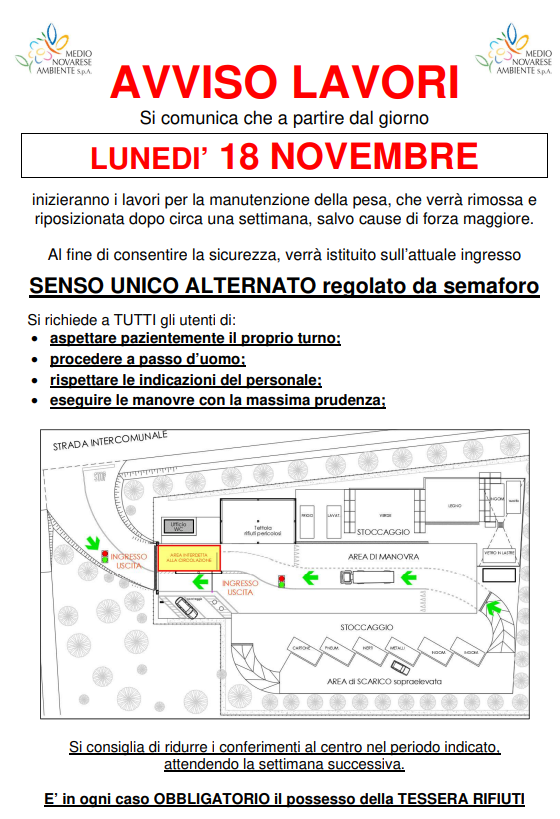Si avvisa la cittadinanza che a partire da lunedì 18 novembre 2024 si avvieranno i lavori per la manutenzione straordinaria della pesa del CDR di Pombia e dureranno una settimana circa (salvo avverse condizioni meteo).
