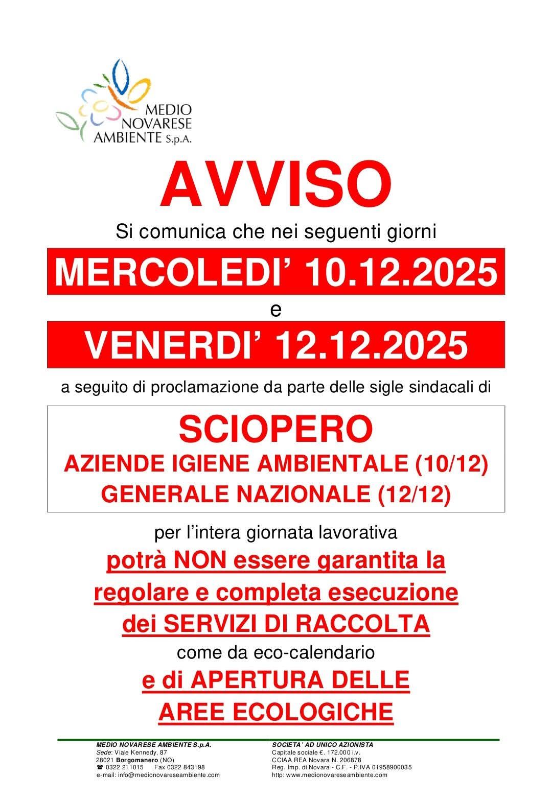 A causa dello sciopero nazionale del settore igiene ambientale proclamato per il 10 dicembre 2025 e quello generale proclamato per il 12 dicembre 2025, medio novarese ambiente avvisa che potrà non essere garantita la regolare e completa esecuzione del servizio di raccolta come da ecocalendario né la regolare apertura del centro di conferimento.