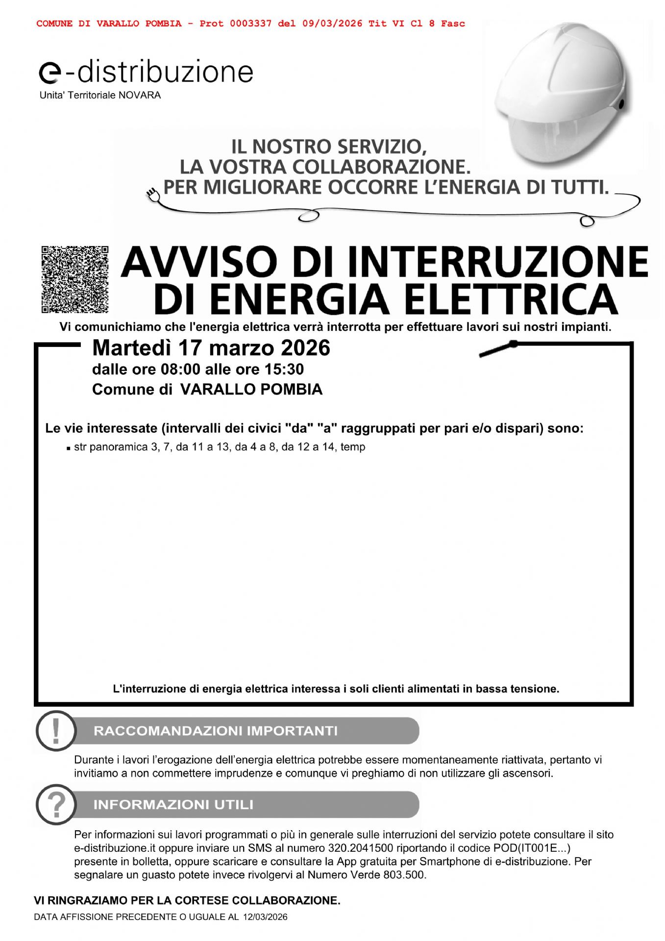 Martedì 17 marzo 2026, dalle ore 08:00 alle ore 15:30, è prevista un'interruzione dell'energia elettrica, per consentire lavori sugli impianti da parte di e-distribuzione.