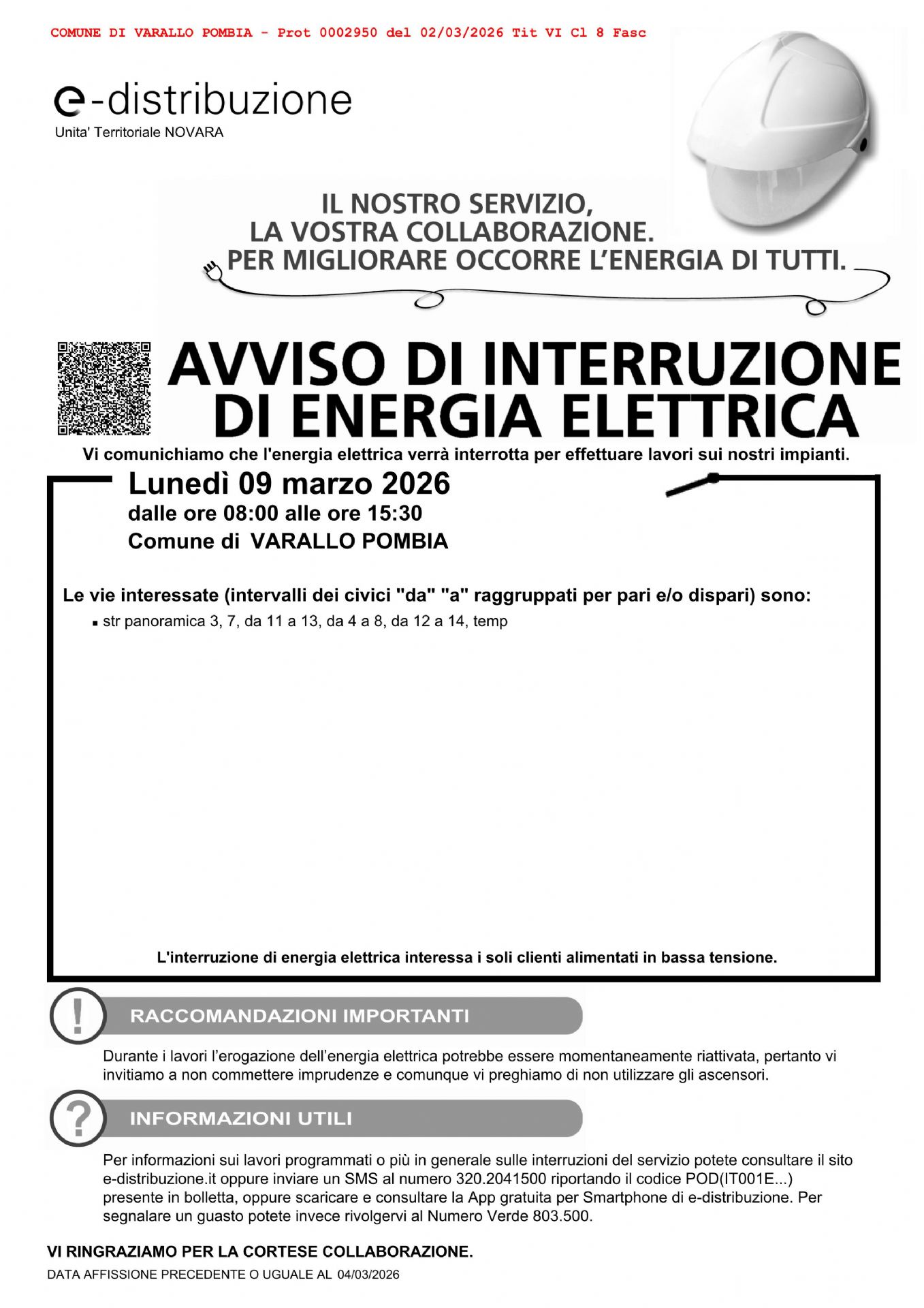 Lunedì 9 marzo 2026, dalle ore 08:00 alle ore 15:30, è prevista un'interruzione dell'energia elettrica, per consentire lavori sugli impianti da parte di e-distribuzione.