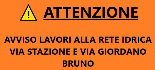 Si avvisa che il giorno 11 febbraio 2026, a partire dalle ore 8:30, é previsto un intervento urgente di riparazione della rete idrica in via Stazione, all’altezza del civico 29 (incrocio con via Giordano Bruno).