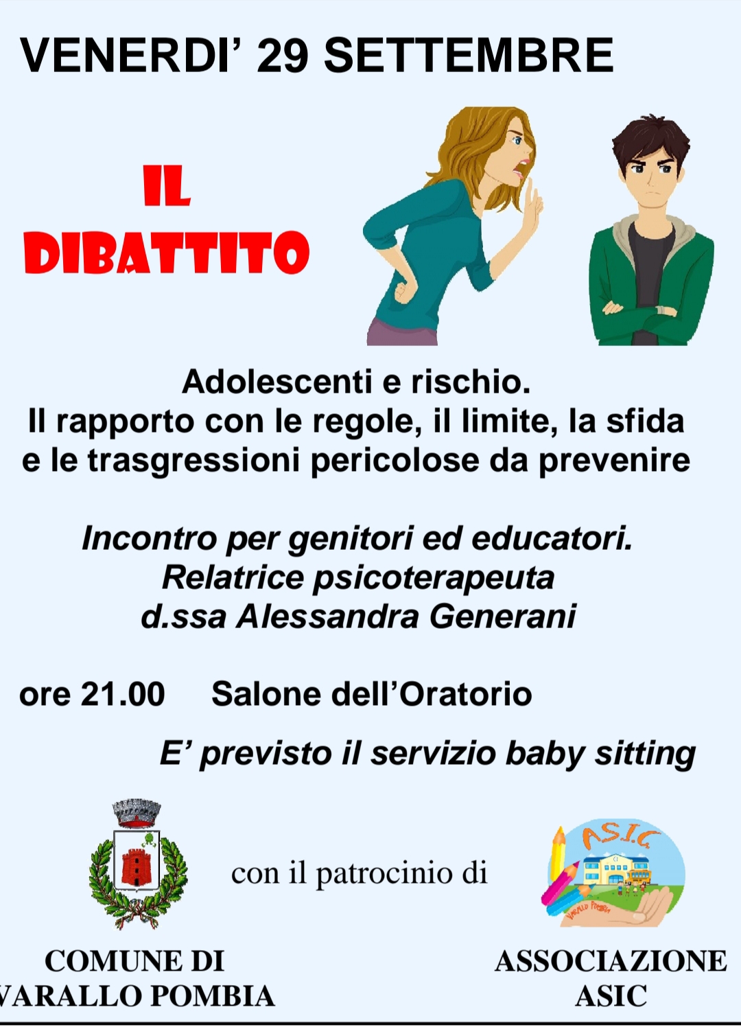 Il Comune di Varallo Pombia e l'Associazione ASIC hanno organizzato per il 29 settembre un incontro rivolto a genitori ed educatori sul tema "Adolescenti a rischio - Il rapporto con le regole, il limite, la sfida e le trasgressioni pericolose da prevenire", incontro che avrà come relatrice la Dr.ssa Alessandra Generani, psicoterapeuta.