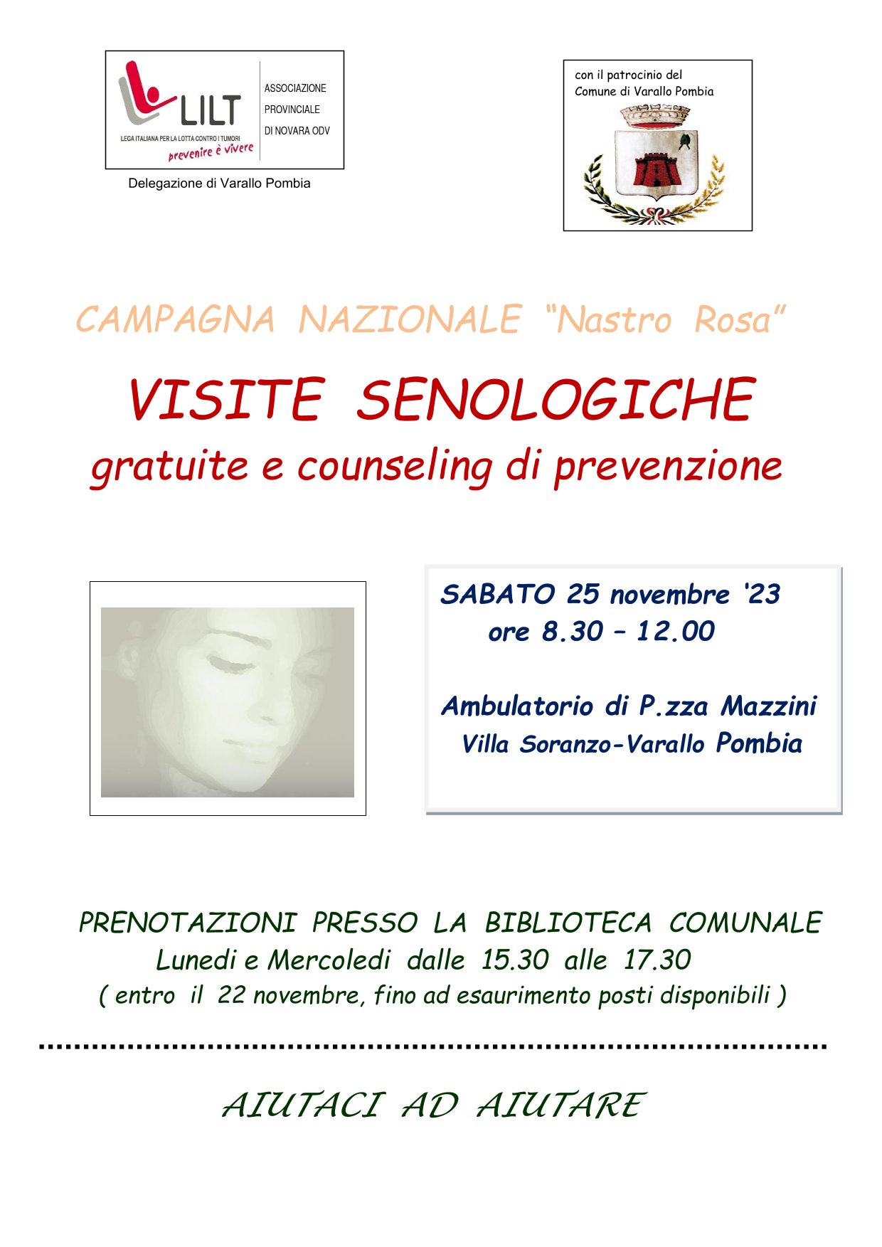 SABATO 25 novembre ‘23 dalle ore 8.30 alle ore 12.00, presso l'Ambulatorio di P.zza Mazzini - Villa Soranzo-Varallo Pombia.