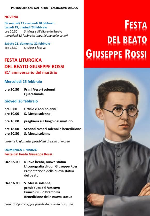 In occasione dell’81° anniversario del martirio del Beato Giuseppe Rossi, la Parrocchia San Gottardo di Castiglione Ossola ha in programma diversi appuntamenti tra celebrazioni religiose e preghiera. Dal 17 al 24 febbraio é prevista la Novena,...