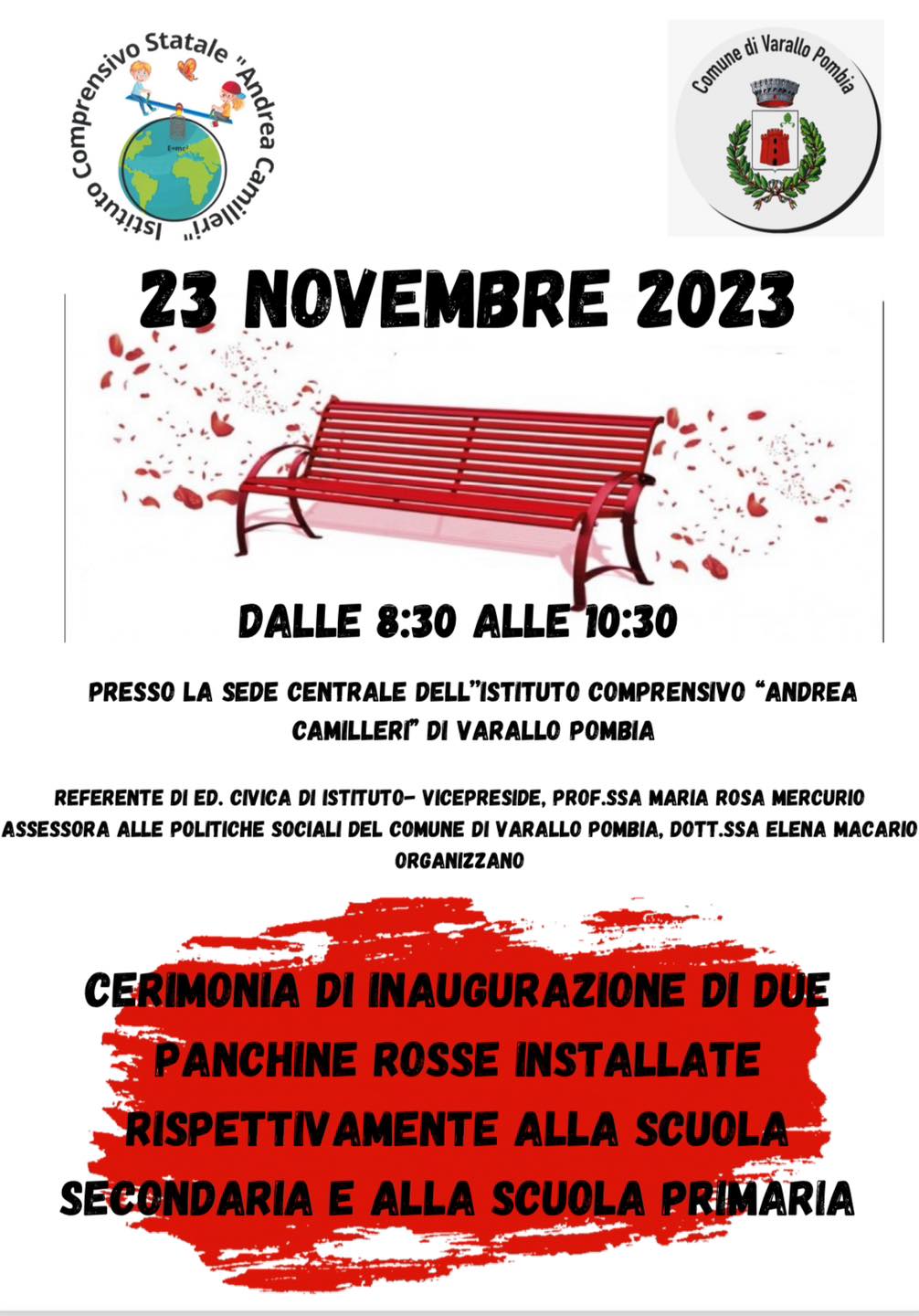 In occasione della Giornata internazionale contro la violenza sulle donne, giovedì 23 novembre, dalle 8.30 alle 10.30, è prevista l’inaugurazione di due panchine rosse, installate alla Scuola Primaria e alla Scuola Secondaria del nostro Istituto Comprensivo "Andrea Camilleri".