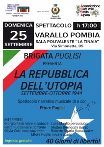Domenica 25 SETTEMBRE 2016, alle ore 17,00 presso il salone "Tinaia", l'A.N.P.I. Sez. di Varallo Pombia e l'Ass. Stella Alpina, presenta lo spettacolo teatrale: La Repubblica dell'Utopia - settembre ottobre 1944, spettacolo narrativo musicale di e con Ettore Puglisi.