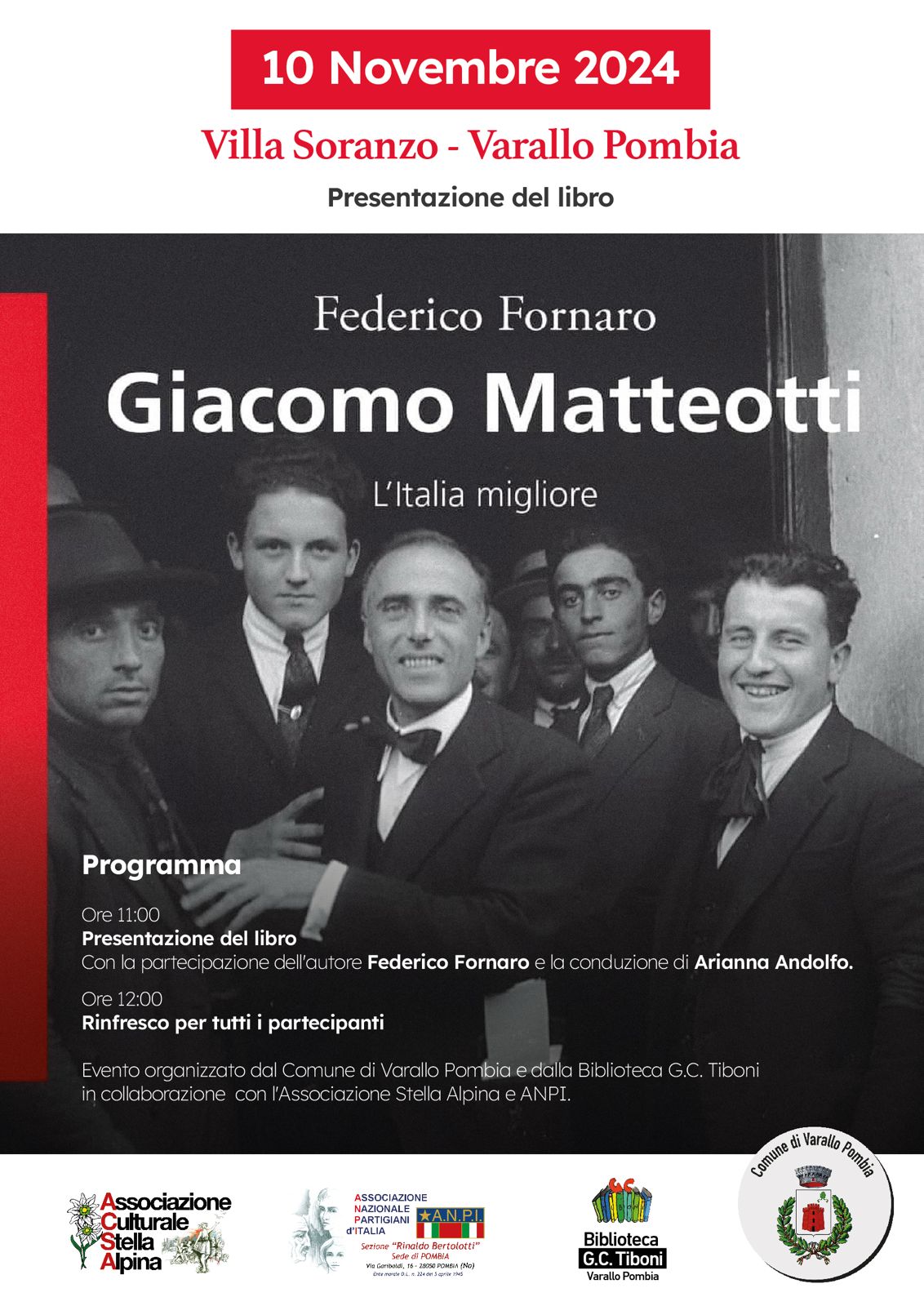 Domenica 10 novembre, con il supporto di ANPI e Associazione Stella Alpina, è in programma la presentazione del nuovo volume di Federico Fornaro, “Giacomo Matteotti - L’Italia migliore”.