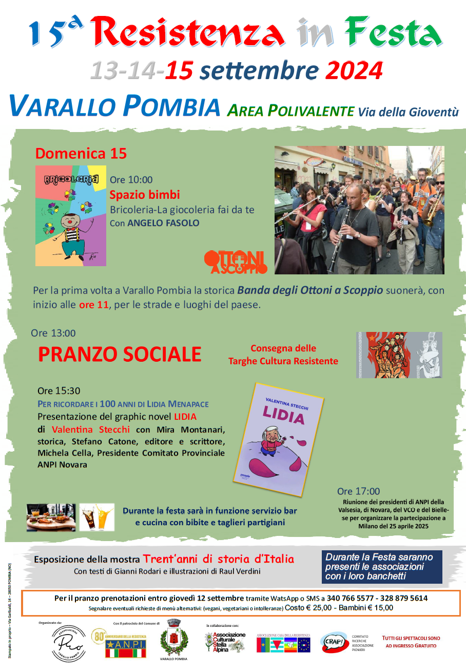 Domenica 15 giornata ricca di eventi per tutta la famiglia, con lo spazio dedicato ai più piccoli, pranzo sociale e nel pomeriggio la presentazione della graphic novel "LIDIA". Dalle ore 11, la Banda degli Ottoni a Scoppio animerà le strade del paese.