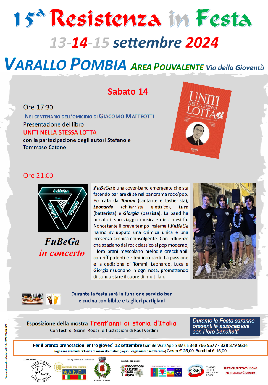 Sabato 14 alle ore 17:30, presentazione del libro "Uniti nella stessa lotta" e alle ore 21 il concerto della band FaBeGa.