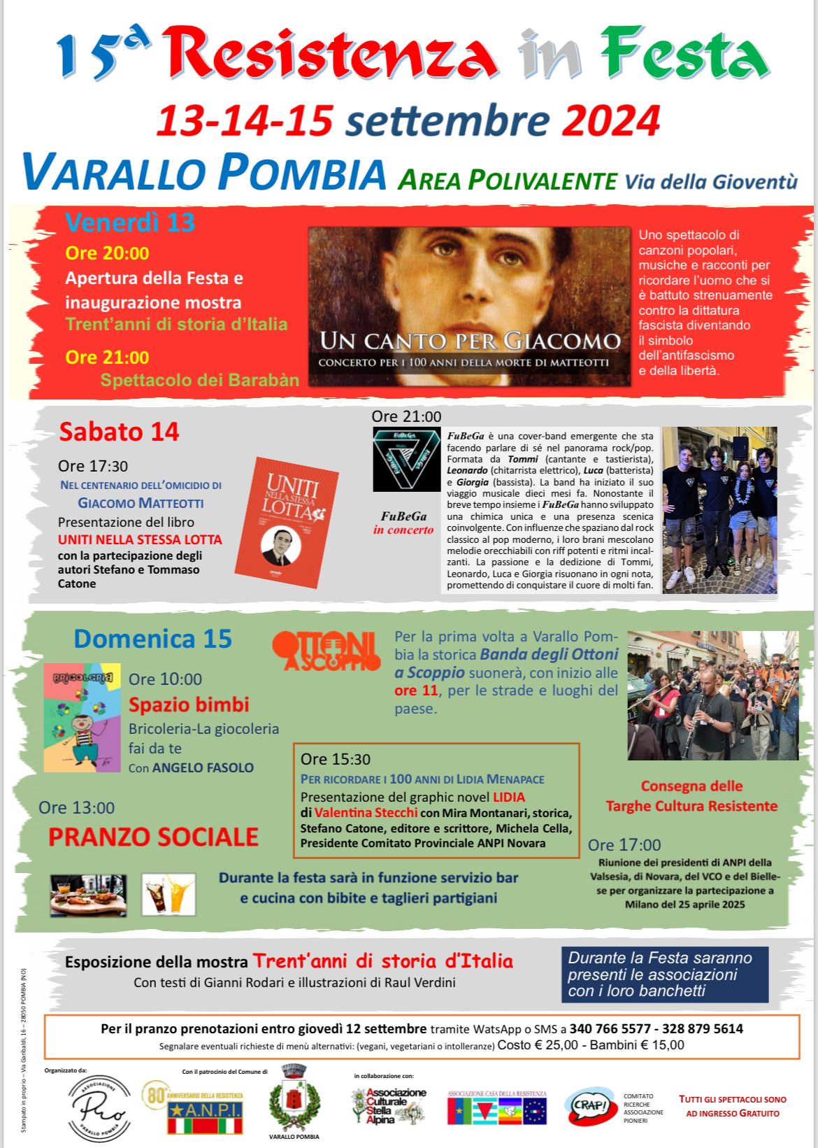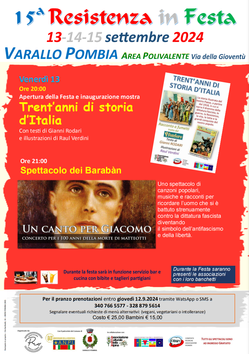 Venerdì 13 alle ore 20, apertura della festa con l'inaugurazione della mostra "Trent'anni di storia d'Italia" e a seguire lo spettacolo musicale "Un canto per Giacomo" dedicato a Giacomo Matteotti.