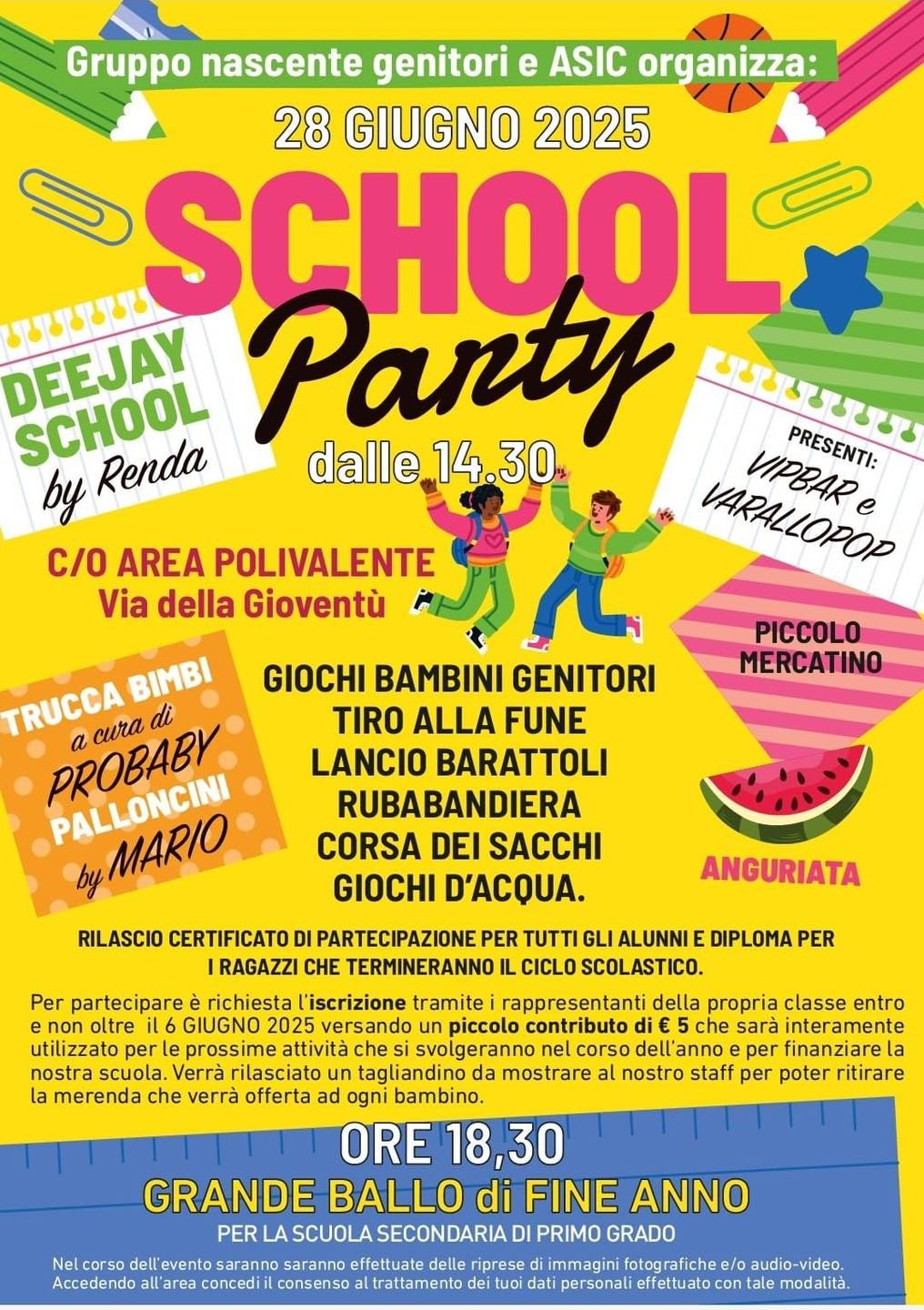 Dalle 14:30 parte lo SCHOOL PARTY con giochi, animazione, mercatino, anguriata e tante sorprese, con la musica di Deejay School by Renda!