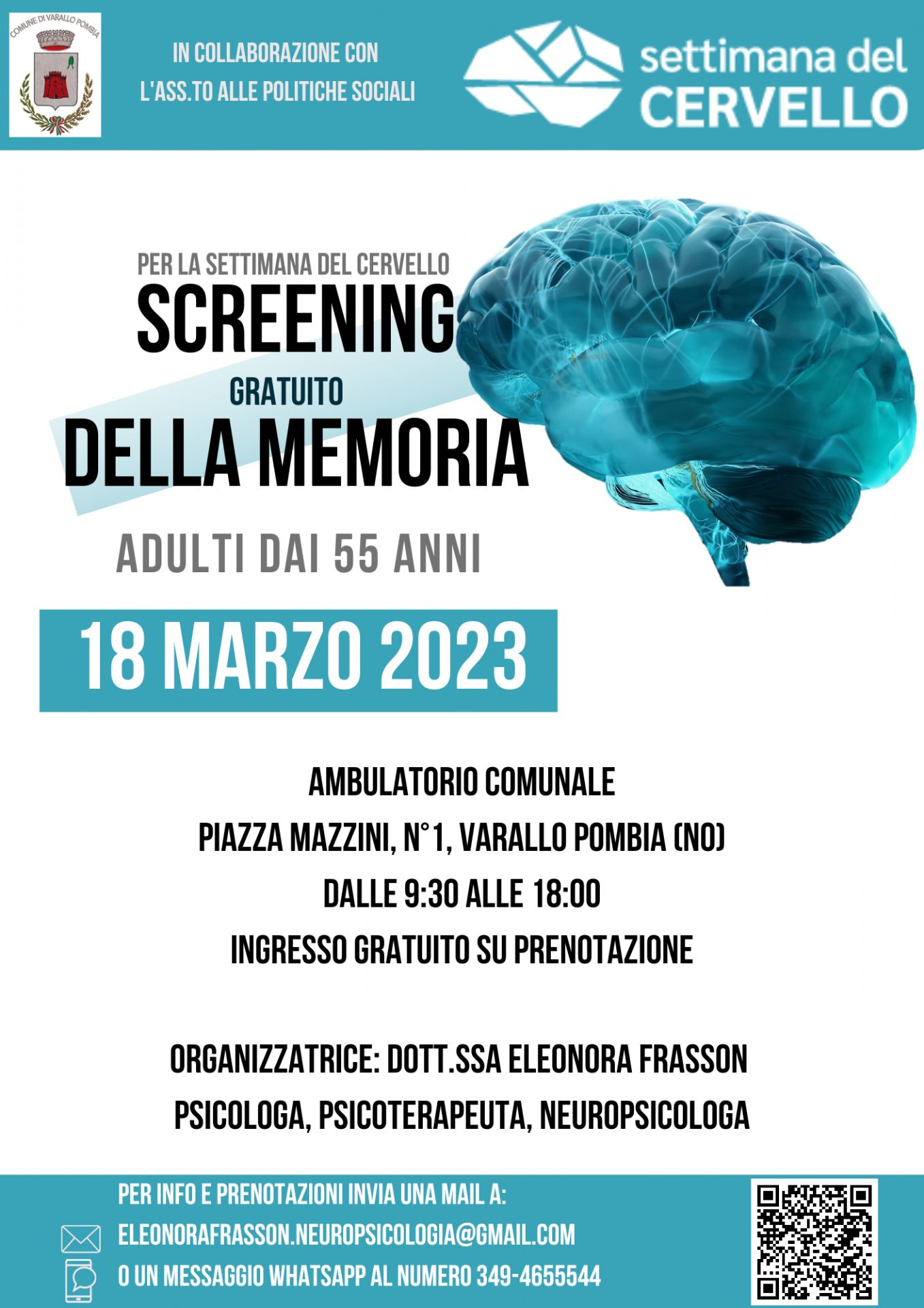 La dr.ssa Eleonora Frasson, psicologa, psicoterapeuta e neuropsicologa, organizza per Sabato 18 marzo 2023, nell'ambito della "Settimana del Cervello", lo SCREENING gratuito della MEMORIA per gli adulti con più di 55 anni.