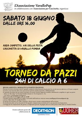 l'Associazione Varallo Pop organizza quest'anno un torneo 24 ore di Calcio a 6, di beneficenza, presso l'area attrezzata di Cascinetta, ex scuola Primaria, tra il 18 e il 19 di Giugno!