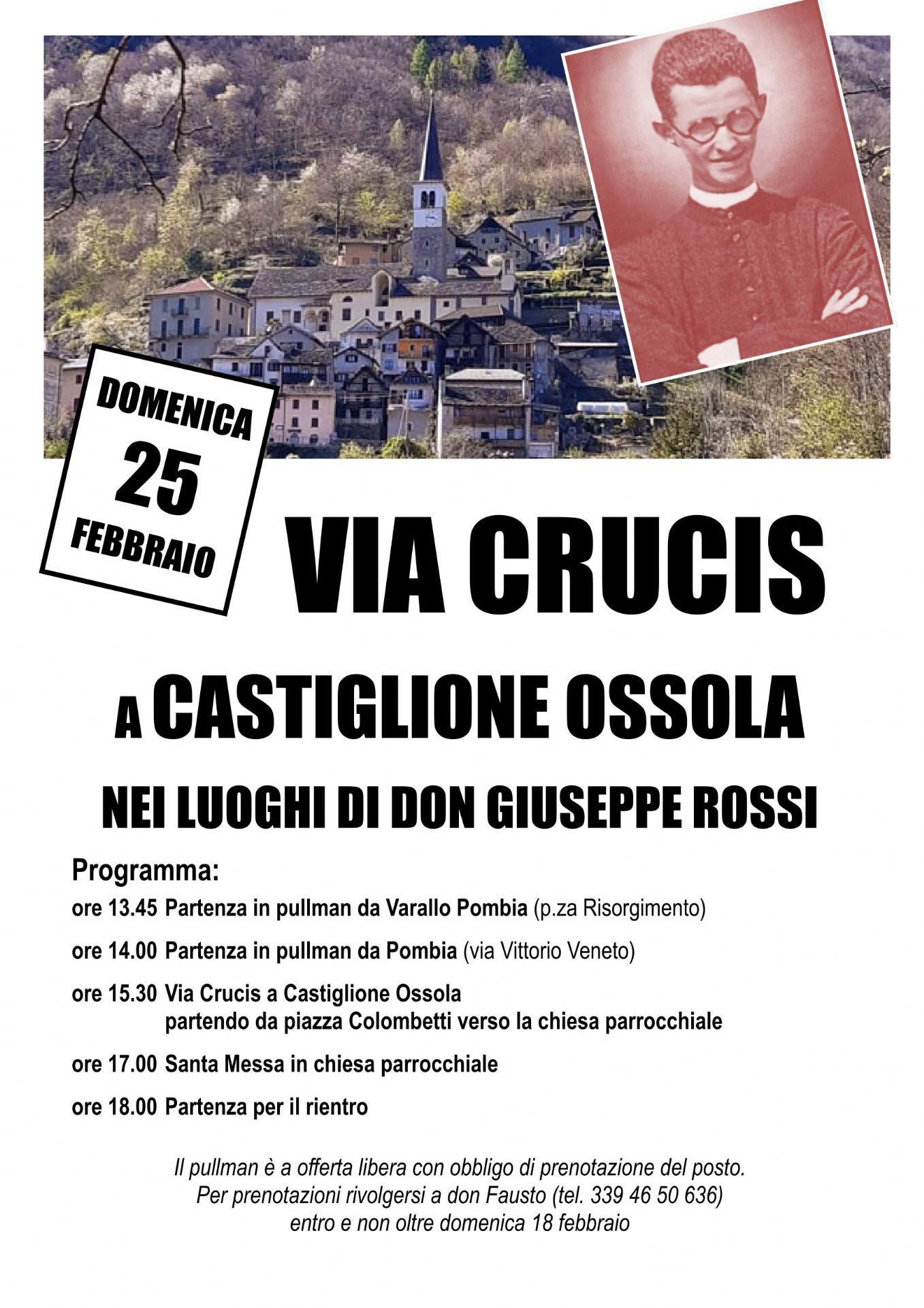 Domenica 25 febbraio, giorno festivo vicino alla data del martirio di don Giuseppe Rossi (26 febbraio), la Parrocchia ha organizzato una trasferta a Castiglione Ossola per rievocare la figura di don Rossi prossimo beato attraverso una Via Crucis e una Celebrazione Eucaristica.