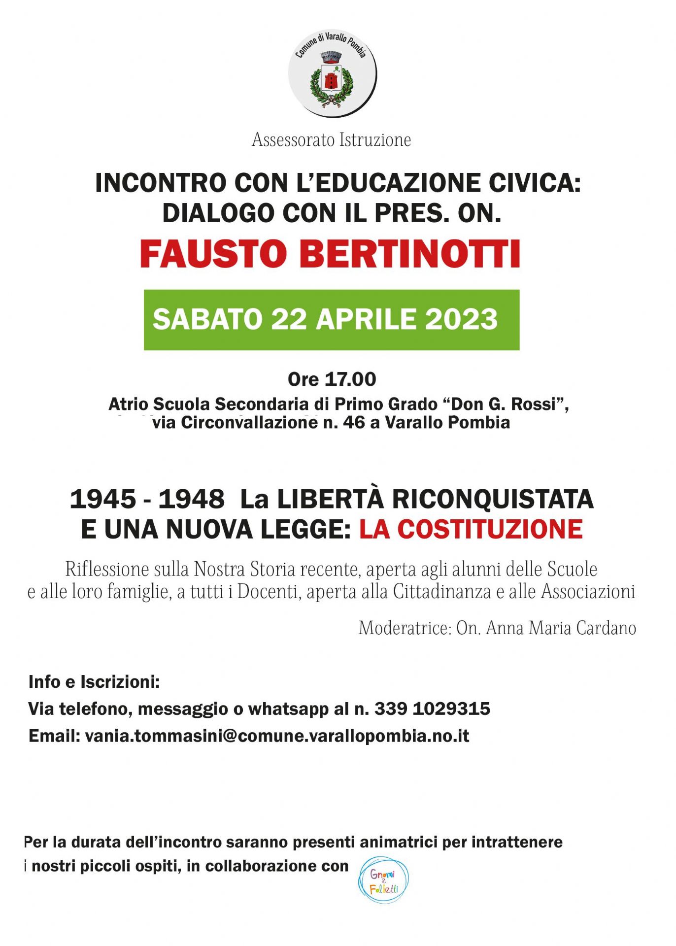 Incontro con l'Educazione Civica: dialogo con il Pres. On. Fausto Bertinotti - SABATO 22 APRILE 2023, ore 17,00 presso l'Atrio della Scuola secondaria di primo grado "Don G. Rossi" - Via Circonvallazione, 46 - Varallo Pombia.