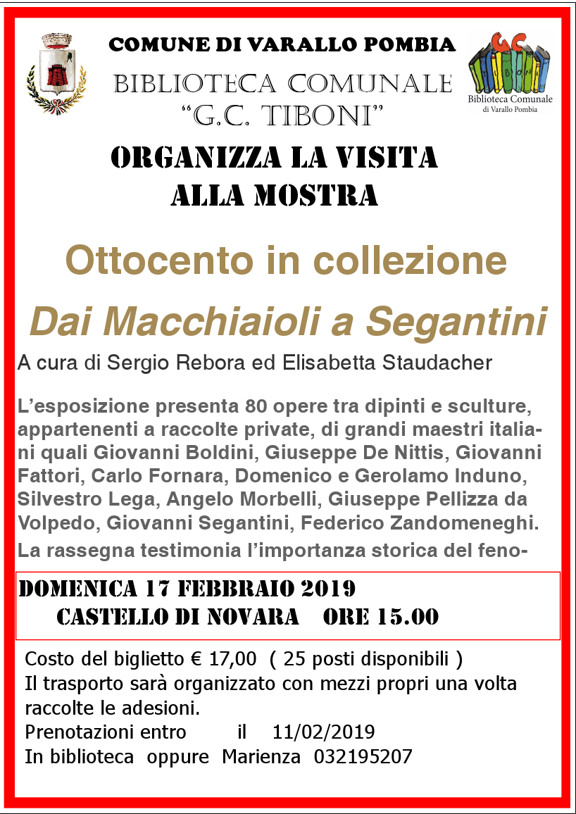La Biblioteca comunale organizza una visita alla mostra"Ottocento in collezione - dai Macchiaioli a Segantini"al Castello di Novara per DOMENICA 17 FEBBRAIO 2019.